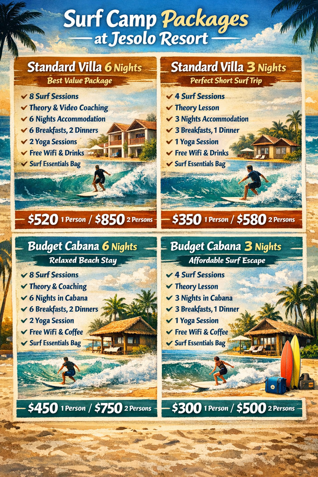 At Jesolo Resort, our mission is to make your stay in Arugam Bay simple, relaxing, and unforgettable. We aim to give you a complete surf and beach experience by combining accommodation, surf lessons, food, yoga, and local guidance in one place.